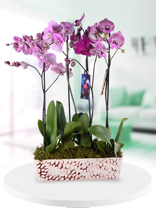 Seramik içi 4 Dallı fuşya renkte orkide bahçesi